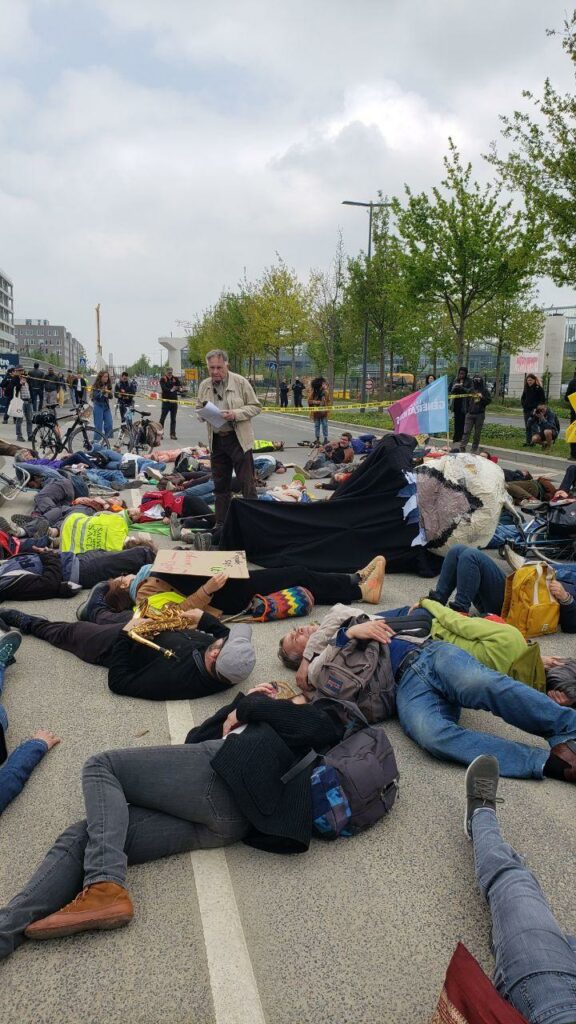 12h, quartier Polytechnique/Corbeville : Après avoir traversé tant de béton, tant de massacres, un die-in a pris place en pensant à toutes ces victimes humaines et non-humaines causés par les travaux d’urbanisation. Un poème JADiste a été lu et malheureusement, ce fût trop d’émotions pour M’Hup qui s’est retrouvée submergée par toutes ces destructions. Un hommage funèbre lui fût donc lu en espérant que cesse l’écocide…